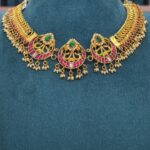 Celebrate timeless tradition with this Antique Kemp Floral Temple Short Necklace. Designed with intricate floral-inspired motifs, this piece is adorned with vibrant ruby-toned kemp stones and highlighted with striking green stone accents at the center, giving it a classic temple jewelry appeal.