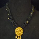 This Antique krishna Black Bead Pendant Necklace beautifully captures the essence of traditional South Indian temple jewellery. The necklace is crafted with multiple strands of fine black beads interspersed with tiny gold-toned accents, giving it a rich and traditional appeal. At its center hangs an exquisitely carved antique-finish Lakshmi pendant, showcasing detailed craftsmanship and auspicious symbolism. The pendant is further adorned with delicate golden pearl drops, adding movement and elegance.