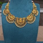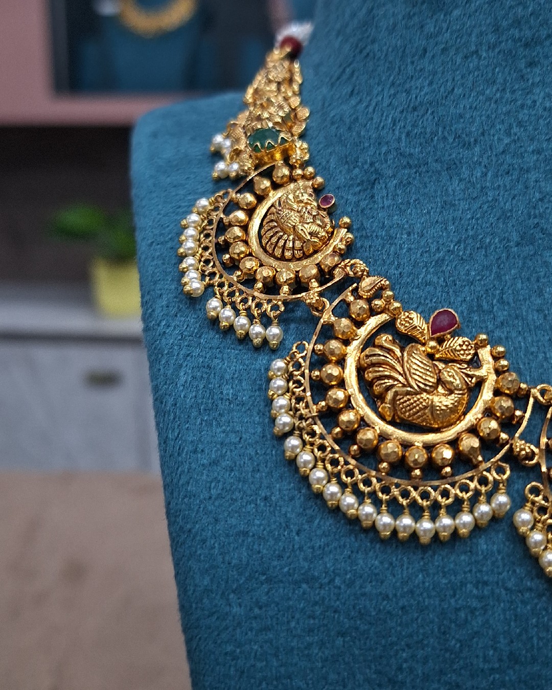 The lower edge is adorned with delicate pearl drops, adding movement and grace to the piece. Crafted in an antique gold finish, this necklace blends heritage craftsmanship with timeless elegance, making it an ideal choice for weddings, festivals, and cultural occasions.