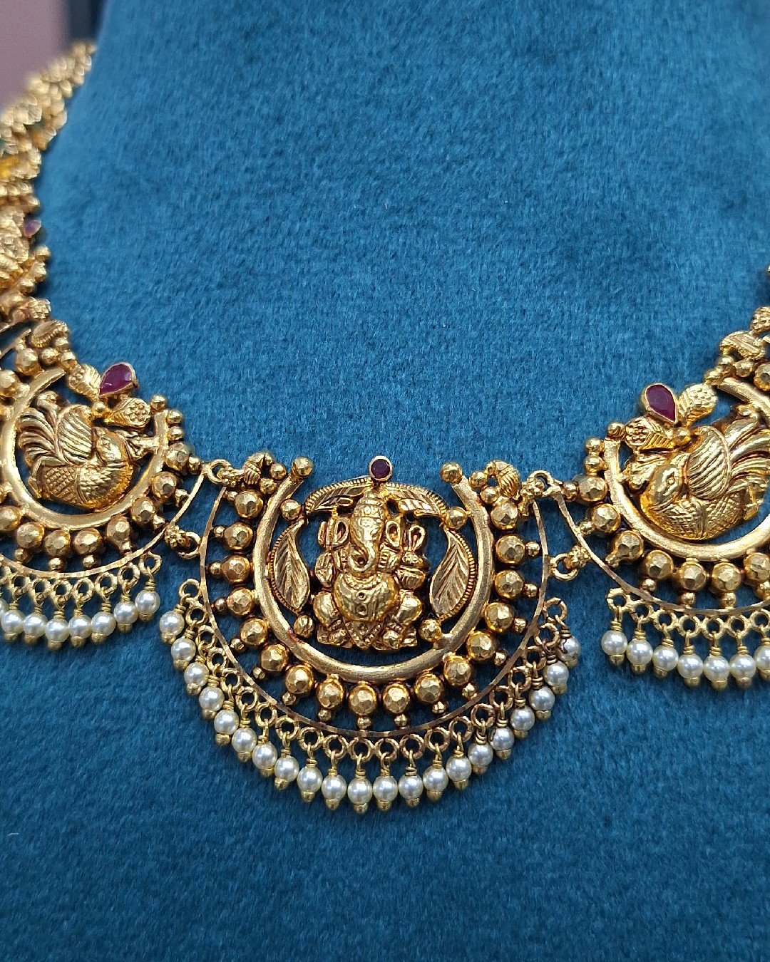 A beautifully crafted antique-style temple necklace featuring a central Ganesha motif, intricate detailing, and elegant pearl drop accents—perfect for traditional and festive wear.