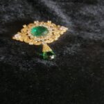 This stunning pendant features a vibrant round emerald stone at the centre, surrounded by an intricate floral arrangement of sparkling crystals set in a rich gold-finish frame. A faceted emerald drop hangs gracefully below, adding movement and refined charm to the design. Perfect for pairing with both simple chains and elaborate necklaces, this pendant brings a touch of luxury and sophistication to bridal, festive, and evening ensembles.