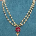 At the center lies a stunning floral pendant, embellished with rich kemp stones and a hint of green accent, creating a striking contrast. The pendant is further enhanced with a delicate pearl drop, adding movement and charm to the design.