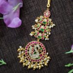 This Kundan Peacock Temple Maang Tikka is a masterpiece of traditional craftsmanship, showcasing a beautifully carved peacock enclosed within a circular ruby-bordered frame. The upper sections are adorned with intricate kundan work in vibrant ruby and emerald tones, enhanced with dainty pearl clusters that add movement and charm. Crafted in a rich gold-finish, this maang tikka is perfect for brides, festive occasions, and classical looks. Its luxurious detailing and elegant design make it a standout accessory that elevates any traditional attire with grace and grandeur.