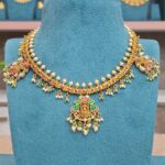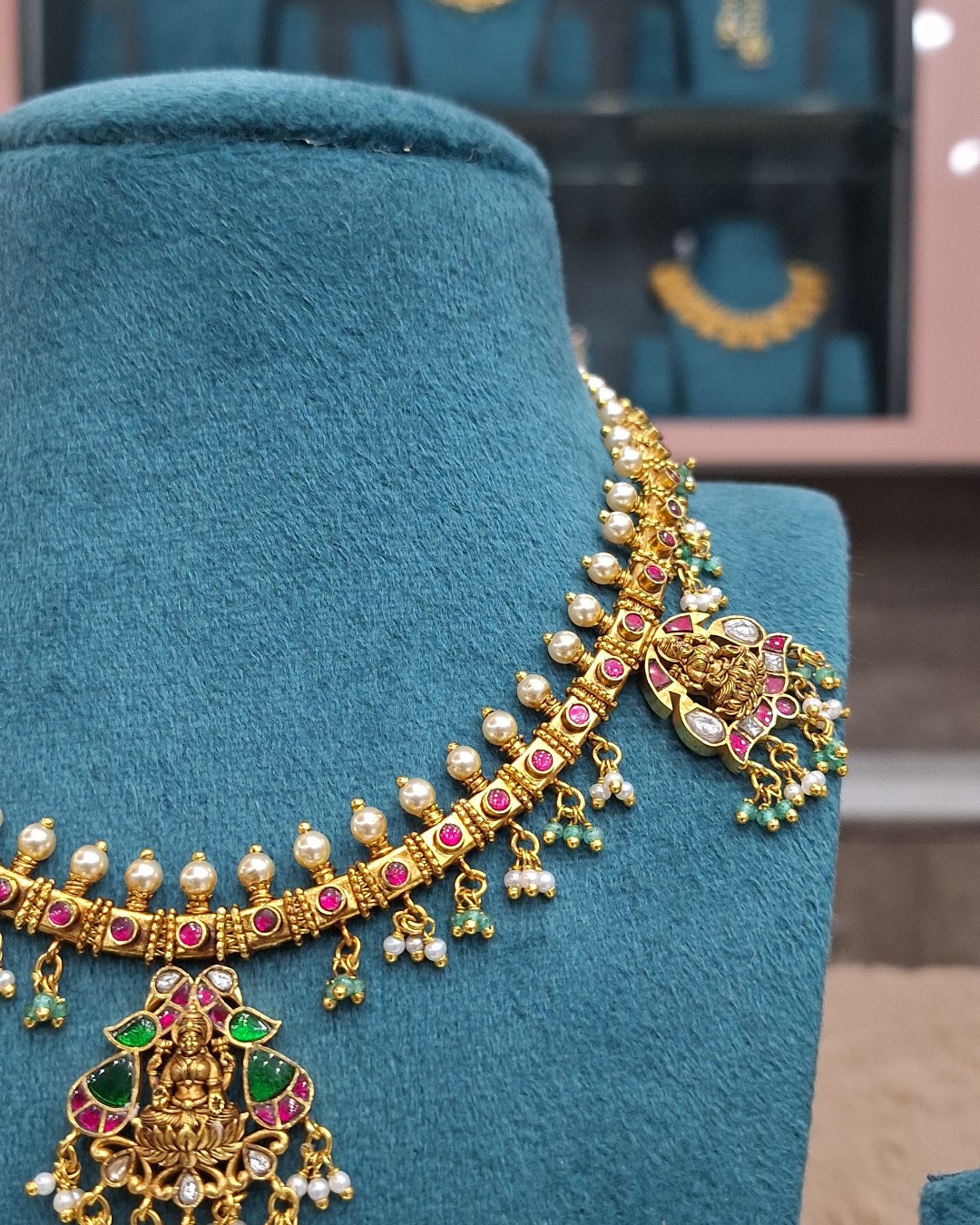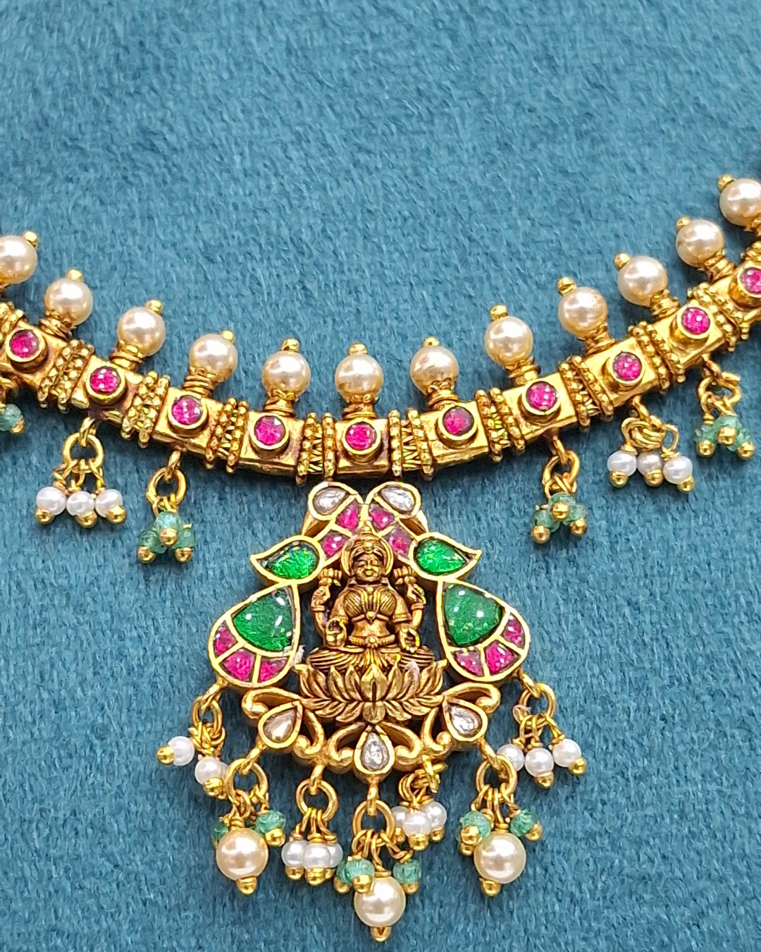 A classic temple choker adorned with ruby stones, Lakshmi motifs, and elegant pearl danglings.