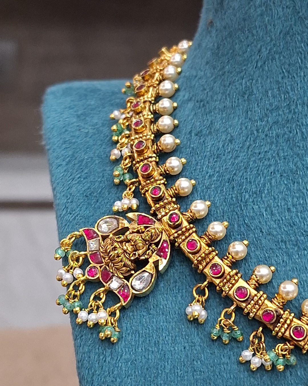 This beautiful temple choker is a perfect blend of tradition and elegance. Crafted in a rich antique gold finish, the necklace features a continuous line of ruby-toned stones, accented with delicate pearl drops that add grace and movement.