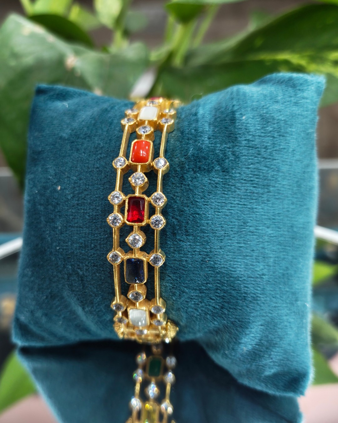 Celebrate tradition with a modern twist through this Navratna Grid Gold Bracelet. Designed with a unique open framework, the bracelet showcases a series of vibrant multi-colored stones arranged in a structured pattern, symbolizing the classic Navratna concept.