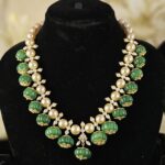 Charming pearl short bunch necklace adorned with graceful green drops, crafted in gold sheet jewellery for a classic and elegant look. Perfect for traditional and festive occasions.
