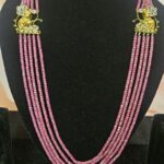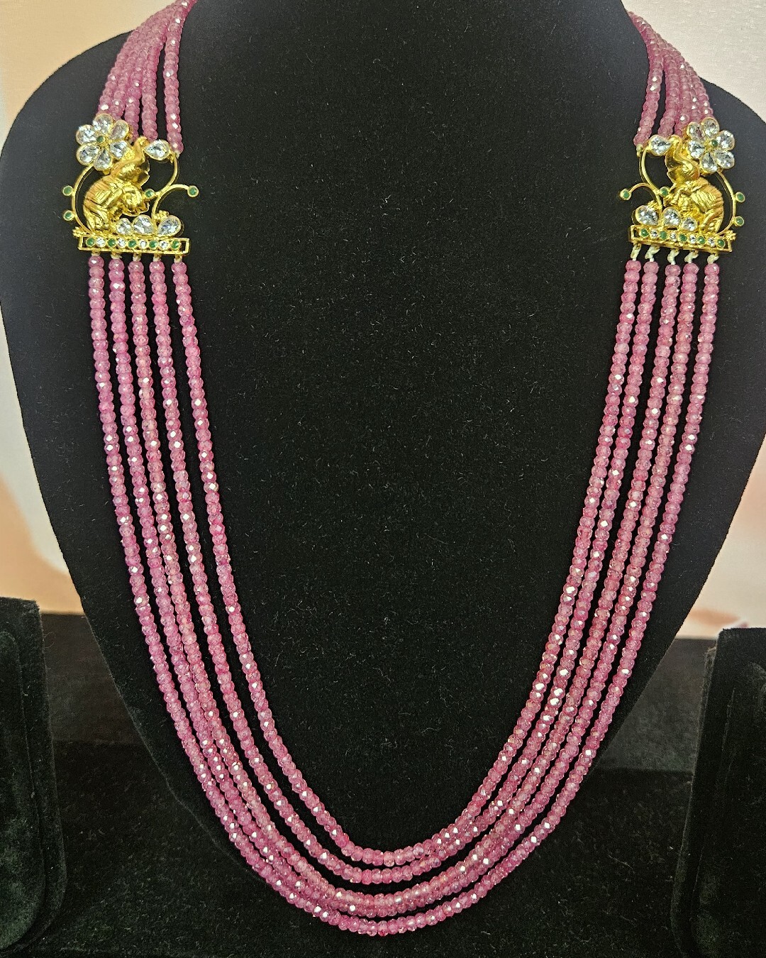 A divine multi-string pink beaded mala adorned with golden side pendants and floral detailing, blending elegance with spiritual charm.