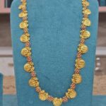 Presenting the exquisite Ram Parivar Kasulu Haram, a timeless piece inspired by sacred temple jewelry traditions. This haram is adorned with beautifully detailed coin (kasu) motifs, each depicting the divine Ram Parivar, symbolizing righteousness, unity, and prosperity.