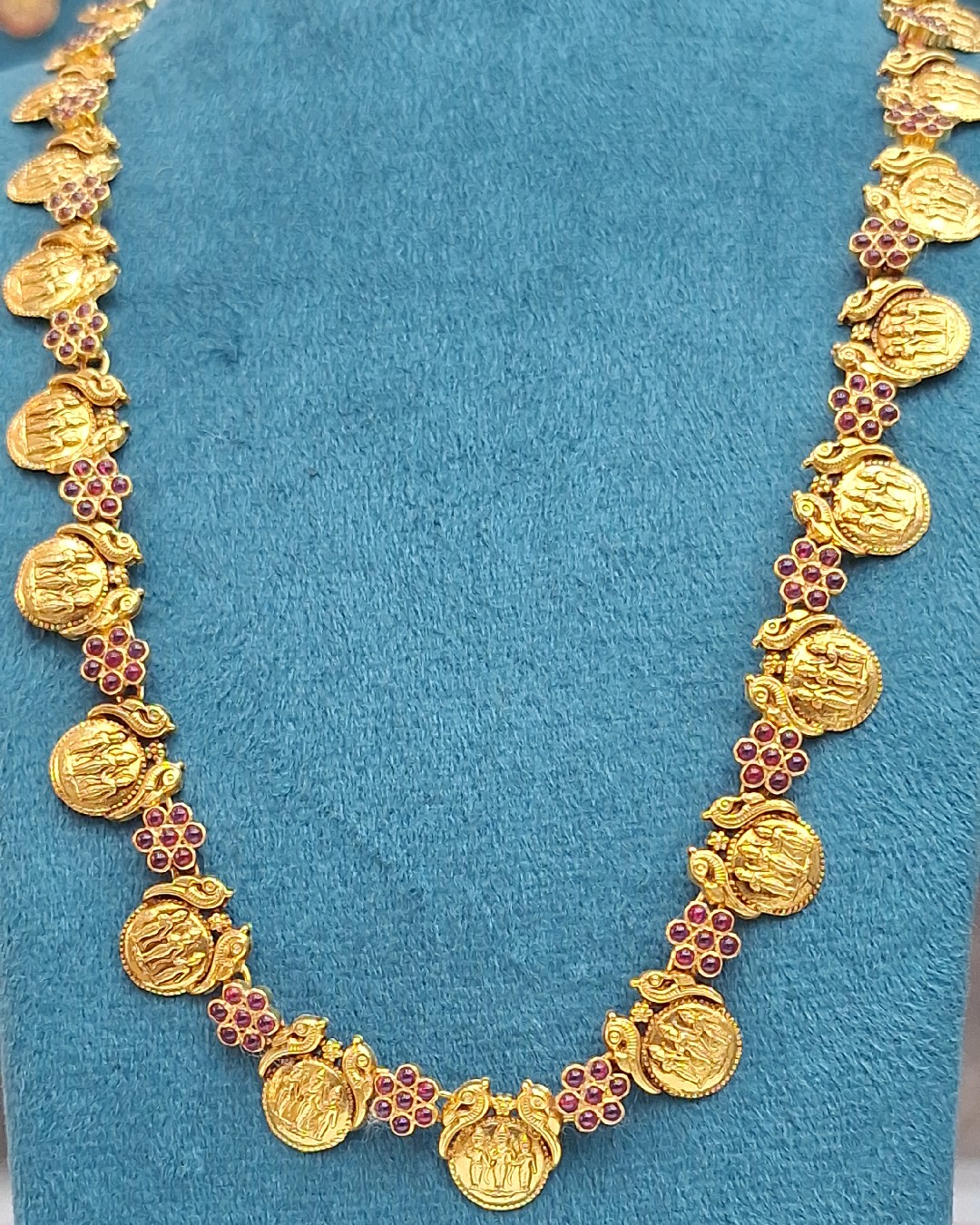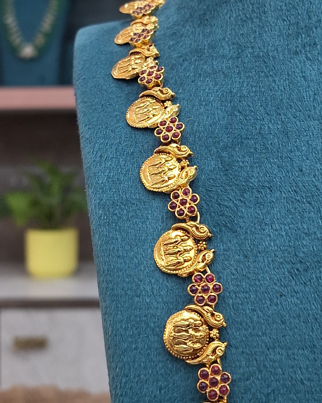 Interlinked with intricate elements and highlighted by rich kemp stone clusters, the design brings together spiritual significance and artistic craftsmanship. The antique gold finish enhances its heritage appeal, making it ideal for weddings, religious ceremonies, and festive celebrations. Graceful and meaningful, this Kasulu Haram is more than just jewelry—it is a reflection of devotion and tradition, crafted to add a divine touch to your ensemble.