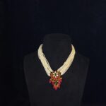 This Royal Crescent Kundan Multistrand Pearl choker beautifully blends classic Indian craftsmanship with elegant design. The choker features multiple strands of fine pearl-like beads that sit gracefully around the neck, offering a rich and sophisticated look. At its center lies a striking crescent-shaped pendant embellished with premium Kundan stones and deep red enamel, enhanced further by clusters of dangling red beads for added charm and movement.