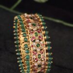The design is beautifully enhanced with emerald green bead edging on both sides, adding dimension, movement, and a luxurious appeal. The intricate craftsmanship reflects fine detailing and traditional artistry, making this bangle a statement accessory for special occasions.