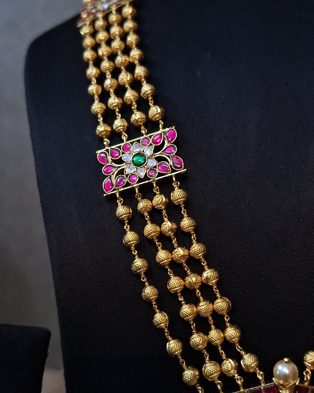 The Royal Ruby Emerald Heritage Haram is a masterpiece inspired by timeless South Indian craftsmanship. Designed with multiple strands of finely detailed gold beads, this necklace creates a rich and royal layered effect that beautifully enhances traditional attire.