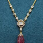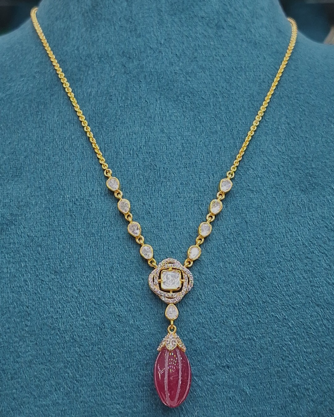The highlight of the piece is the deep red ruby drop, carved in a smooth elongated shape, bringing a luxurious and regal touch to the design. Set in polished gold, the contrast between the dazzling white stones and the rich ruby creates a striking visual appeal.