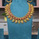 A grand temple-style necklace adorned with ruby stones and intricate paisley motifs, perfect for a bold traditional statement.