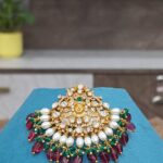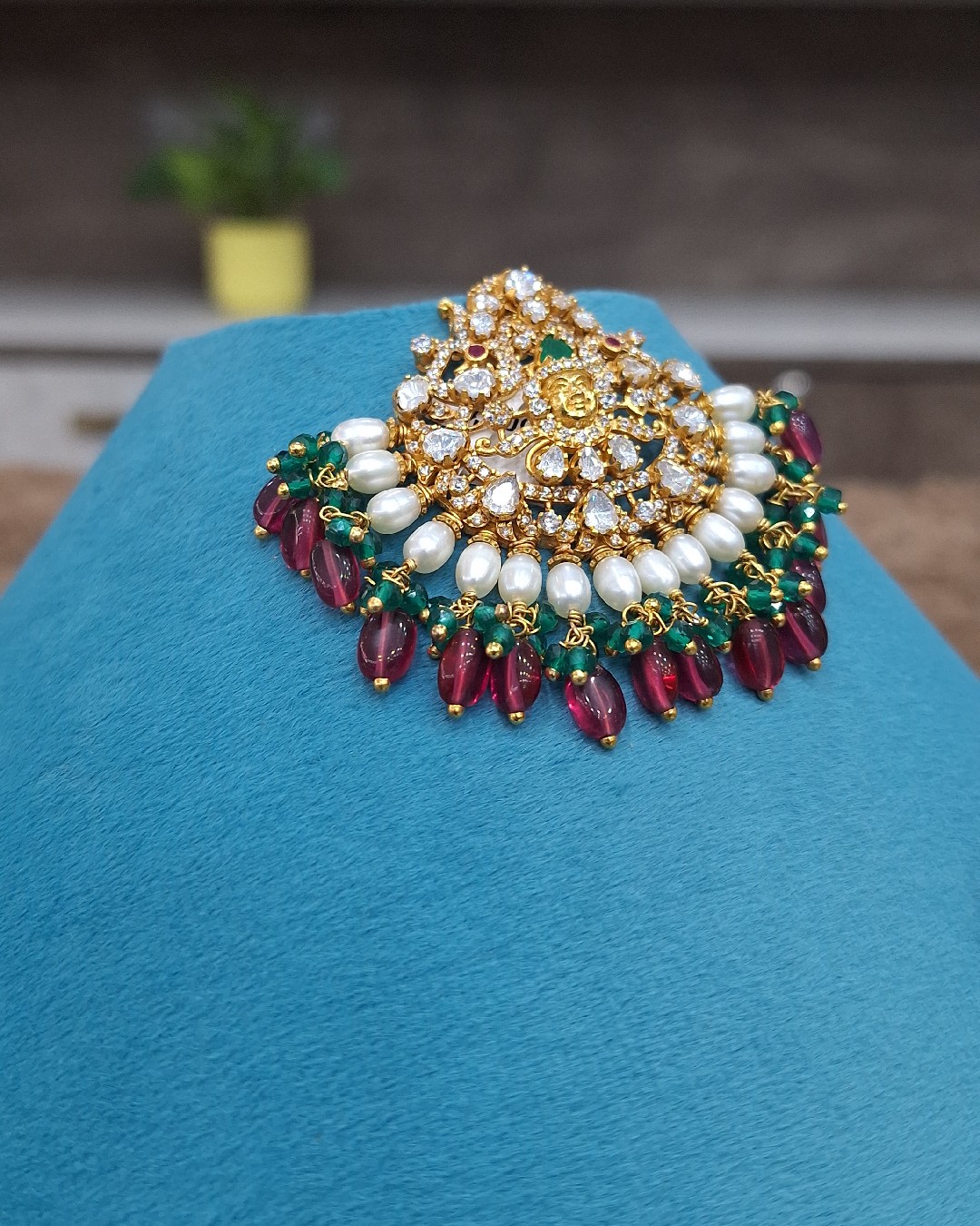 A grand temple-style pendant adorned with sparkling stones, pearls, green beads, and ruby drops, perfect for bridal and festive wear.