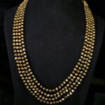 This elegant four-layer necklace features shimmering gold-finish nugget beads arranged in beautifully graduated strands. The faceted texture of each bead reflects light brilliantly, giving the necklace a rich, luxurious appeal. Perfect for pairing with sarees, lehengas, or contemporary ethnic wear, this versatile piece adds sophistication and timeless charm to any festive or bridal ensemble. A statement accessory that enhances both modern and traditional looks.